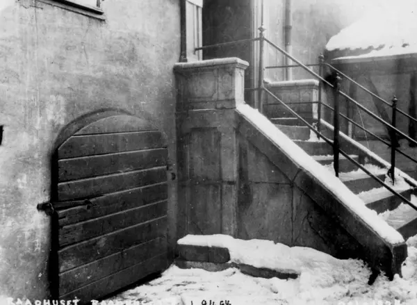 Rådhusgata 7, Oslo. Hus med trapp og lem foran kjellervindu, mot gårdsrom.