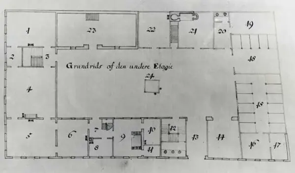 Dronningens gate 15, Oslo. Det gamle Finansdepartement. Foto av grunnriss av den underetasjen. Bygningen står nå på Norsk Folkemuseum.