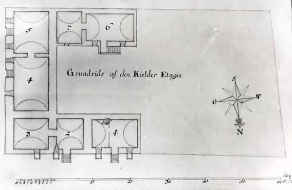 Dronningens gate 15, Oslo. Det gamle Finansdepartement. Foto av grunnriss av den kjelleretasjen. Bygningen står nå på Norsk Folkemuseum.