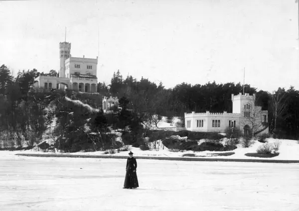 Vinterbilde fra Oscarshall, Bygdøy. Tatt fra sjøen med kvinne på isen.