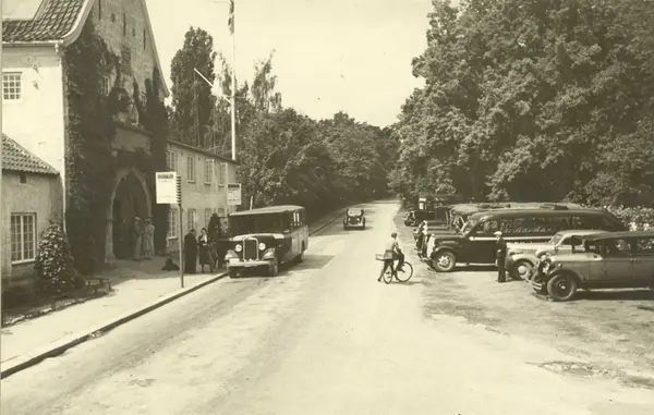 Hovedinngang med stadsporten etc. sett fra Museumsveien. Biler og lave busser står på parkeringsplassen. Norsk Folkemuseum, Oslo 1939.