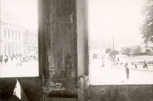 Utsikt gjennom vinduer fra Paleet, Fred Olsensgt.6, Oslo. Etter brannen i 1942.
