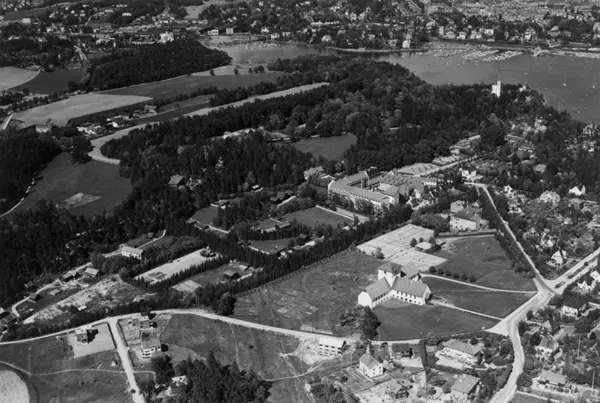 Norsk Folkemuseum og nærliggende områder, oversiktsfoto tatt av Widerøes flyselskap.