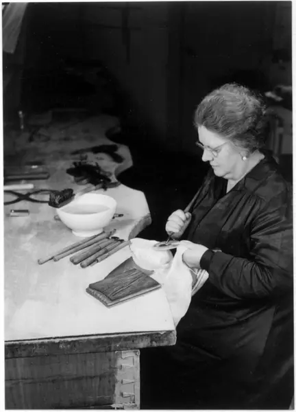 Polering ved frøken Sørum. Gullsmedverksted, J. Tostrup, Oslo.