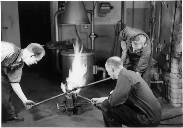 Støping av sølv. Mann heller sølv i gøte, til plans. Sterk gassflamme for å få luften ut. Gullsmedverksted, J. Tostrup, Oslo.