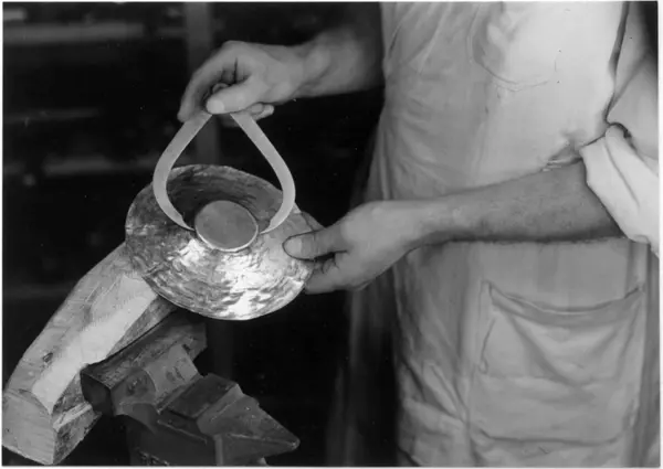 Arbeid med beger. Bunnen måles. Gullsmedverksted, J. Tostrup, Oslo.