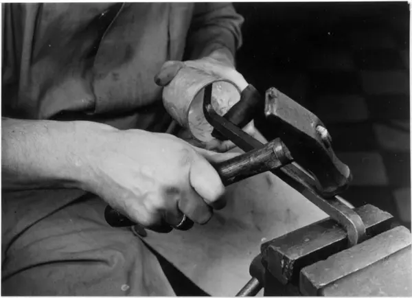 Arbeid med beger. Ciseløren snerrer de bulkete partiene i dekorasjonen. Gullsmedverksted, J. Tostrup, Oslo.