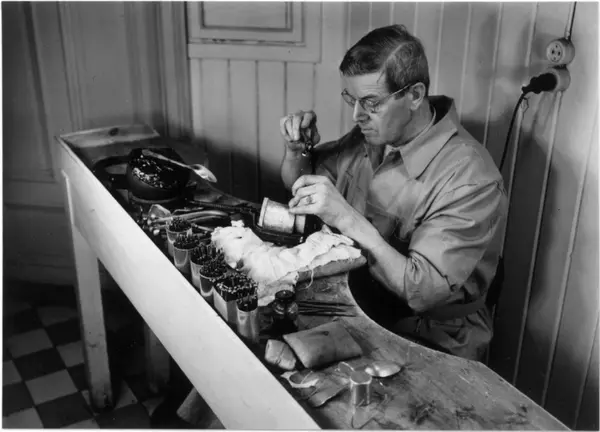 Fra en serie fotografier som viser arbeid ved gullsmedverkstedet J. Tostrup i Oslo, 1951.