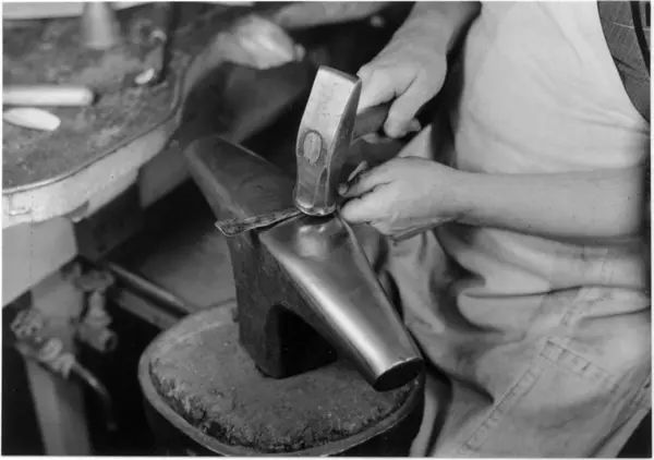 Arbeid med skje. Bladet blir glattslått med mindre smihammer. Gullsmedverksted, J. Tostrup, Oslo.