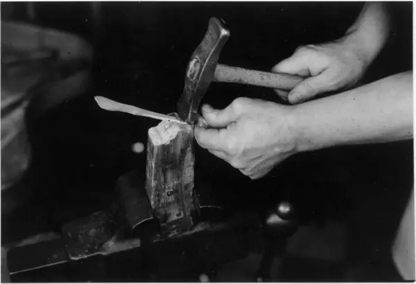 Arbeid med skje. Skjeen får knekk mot bladet med opptrekshammer (penhammer). Skjeen er hvitkokt. Gullsmedverksted, J. Tostrup, Oslo.