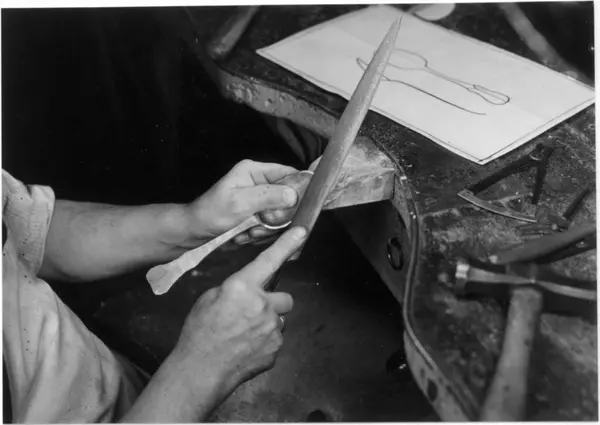 Skjearbeideren filer skjeen. Gullsmedverksted, J. Tostrup, Oslo.