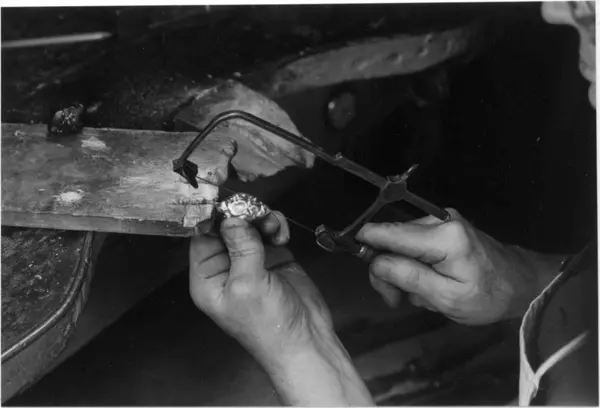 Skjearbeideren sager ren brosjen på skje. Gullsmedverksted, J. Tostrup, Oslo.