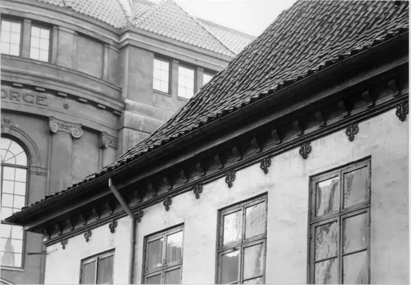 Collett-Cappelengården, Kirkegata 15, Oslo. Bygget i slutten av 1600-tallet og kjøpt av kommerceråd James Collett i 1703. Nå på Norsk Folkemuseum. Tak og vinduer.
