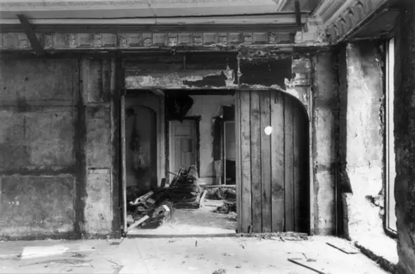 Collett/Cappelengården, Kirkegata 15, Oslo under rivingen i 1939. Bygget i slutten av 1600-tallet og kjøpt av kommerceråd James Collett i 1703. Nå på Norsk Folkemuseum.