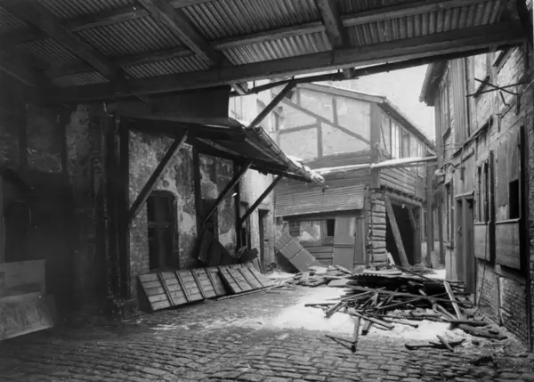 Rødfyllgata 20, Oslo 1954. Under riving. Gårdsrom sett fra under tak, mot øst.