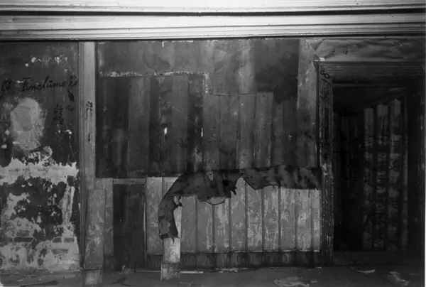 Rødfyllgata 20, Oslo 1954. Under riving. Interiør, detalj av vegg med dør.