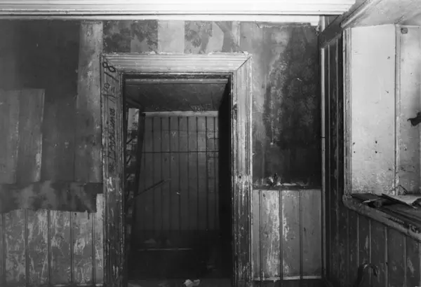 Rødfyllgata 20, Oslo 1954. Under riving. Interiør, detalj av vegg med dør.