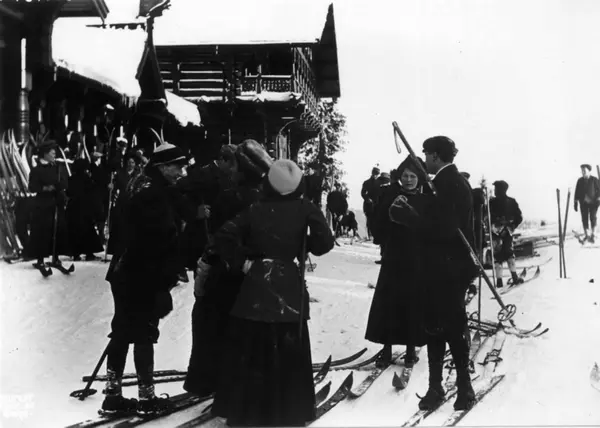 Frognerseteren, Oslo. 1908-1910. Vintermotiv. Skiløpere.