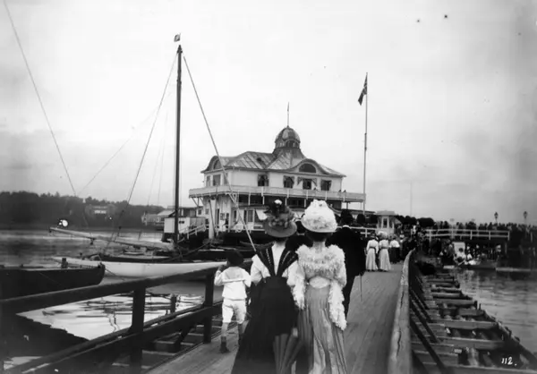 Bygdøy, Oslo 1908. Dronningen restaurant. Mennesker på brua til Dronningen. Kvinner i lange kjoler og med hatter.