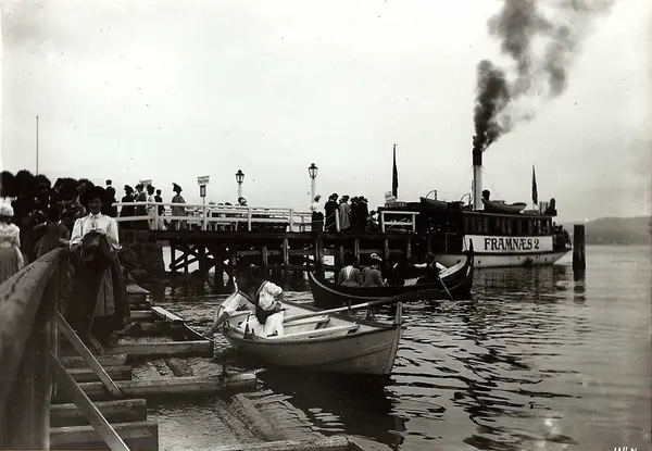 Oslo, Bygdøy 1908. Dronnningen restaurant. Mennesker som står i kø til ferja Framnæs 2 på brygga ved Dronningen. Kvinner i lange kjoler og med hatter. Robåter på vannet.