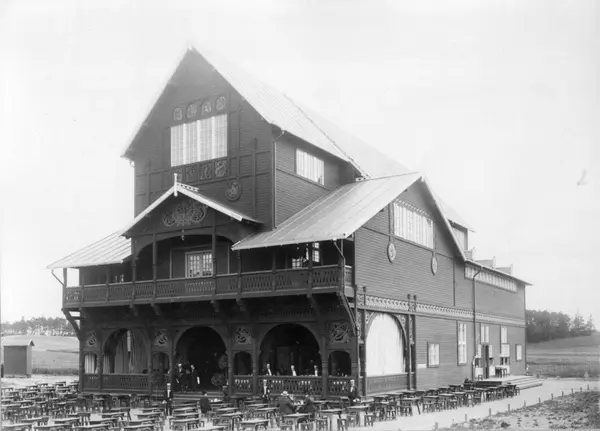 Pariserpaviljongen, bygning nr. 302 på Norsk Folkemuseum, her fotografert i 1903. Huset, som hadde vært på Verdensutstillingen i Paris 1900, ble brukt som restaurant, og åpnet i forbindelse med Den Kulturhistoriske Utstilling.