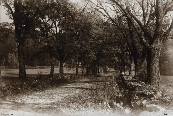 Dette bildet er tatt nordover fra Peder Ankers plass, og huset vi ser i bakgrunnen er mest sansynelig plassen Svarverud under Voksen gård. Til høyre for alleen ser vi Laejordet og til venstre ser vi Himstadjordet.Begge tilhørte Østre Voksen. Landskap, parti av allé med steingjerder og trær med bebyggelse synlig bak. Oppsatt som Voksen gård. Fotografert i 1920 antakelig.