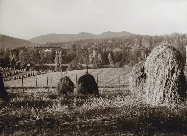 Landskap, Bogstad, Oslo. Oversiktsbilde med Bogstad gård i bakgrunnen. Oversiktsbilde. Bogstadvannet i mellomgrunnen, i forgrunnen jorder med rader av høystakker. Fot. H.C. Neupert (nr.604) ant. 1920.