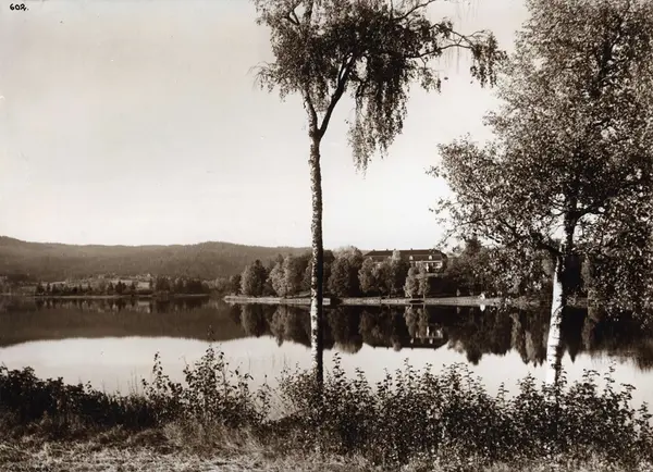 Landskap, Bogstad, Oslo. Oversiktsbilde med Bogstad gård i bakgrunnen. Oversiktsbilde. Bogstadvannet i mellomgrunnen. Fot. H.C. Neupert (nr.602) ant. 1920. Skog.