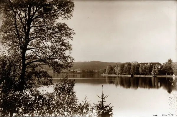 Landskap, Bogstad, Oslo. Oversiktsbilde med Bogstad gård ved Bogstadvannet i bakgrunnen. Oversiktsbilde. Skog. Fotografert av H.C. Neupert (nr.608) ant. 1920.