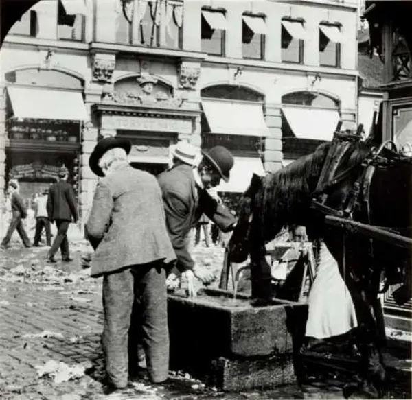 Stortorvet, Oslo ca. 1905. Hest drikker vann på torget foran Glasmagasinet.
