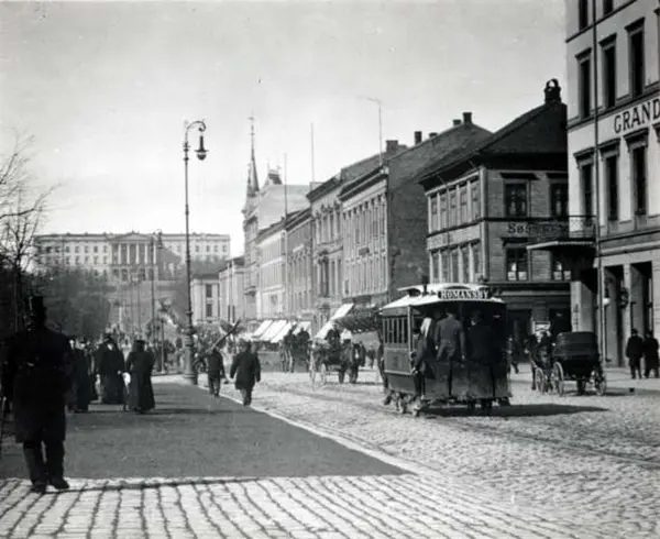 Personvogntransport med hest i Karl Johans gate i Oslo mellom 1893 og 1898.