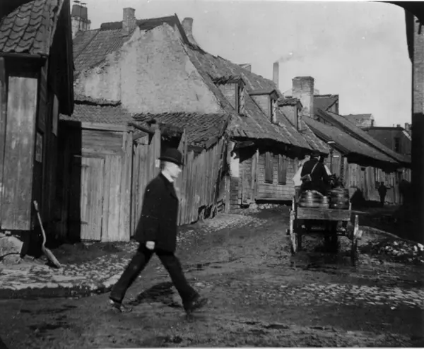 Hammersborg, Oslo 1905. Mann krysser gate med falleferdig trehusbebyggelse. Til 1905-utst. NF.