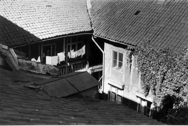 Fred Olsens gate 15, Oslo. Mot gårdsrommet, tatt fra taket på nr. 13 som er flyttet til NF. Hus overgrodd med villvin, klesvask.