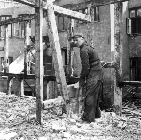 Snekker på Norsk Folkemuseum Ivar Haug, under rivingen av Holmens gate 5 i Pipervika i Oslo. Hele denne gata forsvant med Rådhusreguleringen. Bakgården i Holmens gate 5 er bevart på Norsk Folkemuseum, som bygning nr. 231.