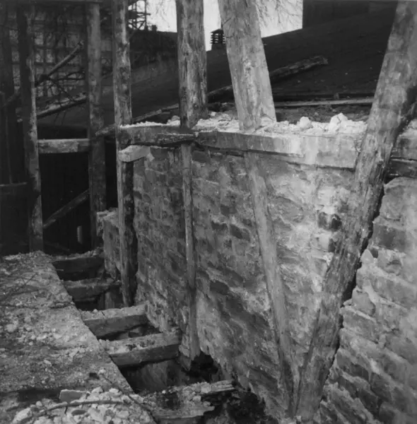 Fra rivingen av Holmens gate 5 i Oslo i Pipervika.Hele denne gata forsvant med Rådhusreguleringen. Bakgården i Holmens gate 5 er bevart på Norsk Folkemuseum, som bygning nr. 231.
