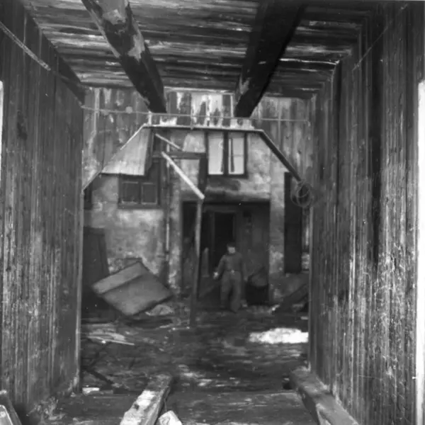 Fra rivingen av Holmens gate 5 i Oslo i Pipervika.Hele denne gata forsvant med Rådhusreguleringen. Bakgården i Holmens gate 5 er bevart på Norsk Folkemuseum, som bygning nr. 231.