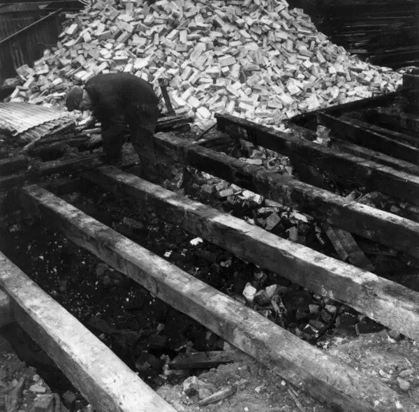 Fra rivingen av Holmens gate 5 i Oslo i Pipervika.Hele denne gata forsvant med Rådhusreguleringen. Bakgården i Holmens gate 5 er bevart på Norsk Folkemuseum, som bygning nr. 231.