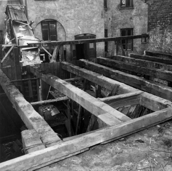 Fra rivingen av Holmens gate 5 i Oslo i Pipervika.Hele denne gata forsvant med Rådhusreguleringen. Bakgården i Holmens gate 5 er bevart på Norsk Folkemuseum, som bygning nr. 231.