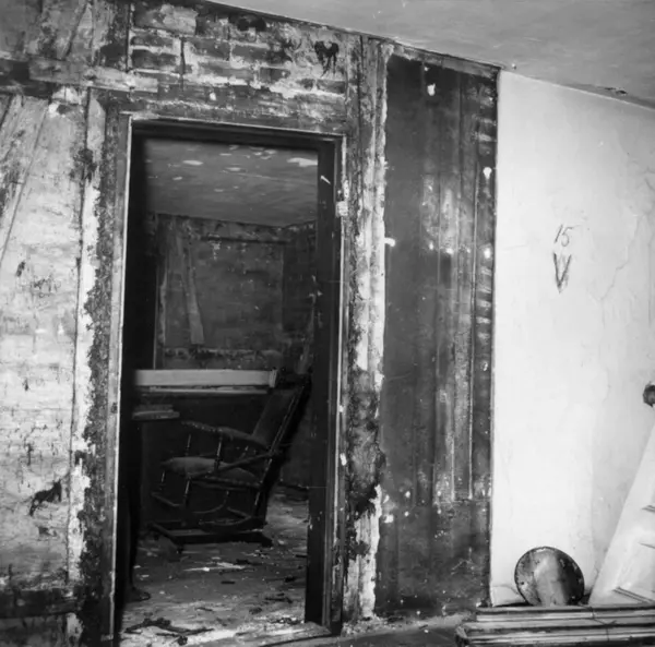 Fra rivingen av Holmens gate 5 i Oslo i Pipervika.Hele denne gata forsvant med Rådhusreguleringen.Bakgården i Holmens gate 5 er bevart på Norsk Folkemuseum, som bygning nr. 231.