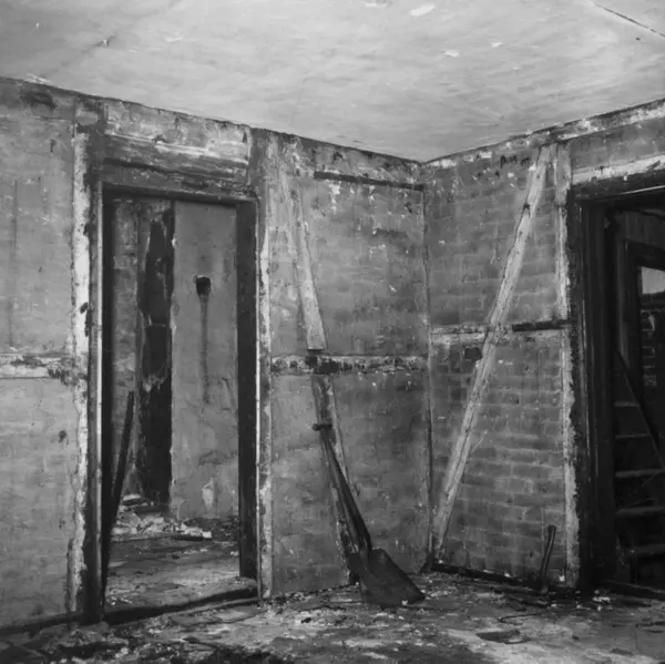 Fra rivingen av Holmens gate 5 i Oslo i Pipervika.Hele denne gata forsvant med Rådhusreguleringen.Bakgården i Holmens gate 5 er bevart på Norsk Folkemuseum, som bygning nr. 231.
