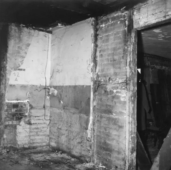 Fra rivingen av Holmens gate 5 i Oslo i Pipervika.Hele denne gata forsvant med Rådhusreguleringen.Bakgården i Holmens gate 5 er bevart på Norsk Folkemuseum, som bygning nr. 231.