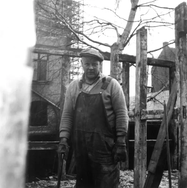 Ottar Amundsen, ansatt på Norsk Folkemuseum, under rivingen av Holmens gate 5 i Oslo i Pipervika.Hele denne gata forsvant med Rådhusreguleringen.Bakgården i Holmens gate 5 er bevart på Norsk Folkemuseum, som bygning nr. 231.