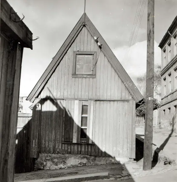 Johannesgata 4, Enerhaugen, Oslo 1959. Lavt trehus på gatehjørne, kortvegg mot syd. Under riving sept./okt -59. Nå på NF.