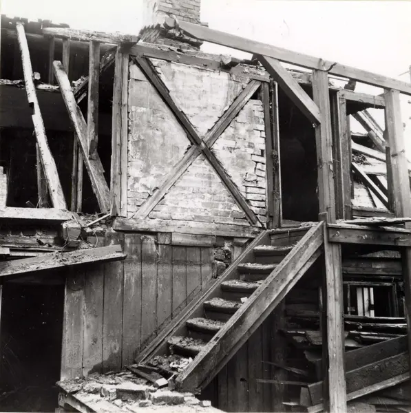 Hjørnet Langleiken og Johannesgata, Enerhaugen, Oslo 1959. Hus under riving.