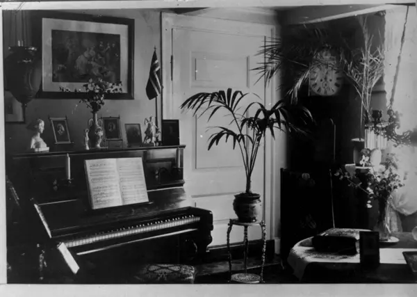 Interiør med piano, norsk flasgg, gulvur, potteplanter fra Kanten 1, Oslo.. 1914.