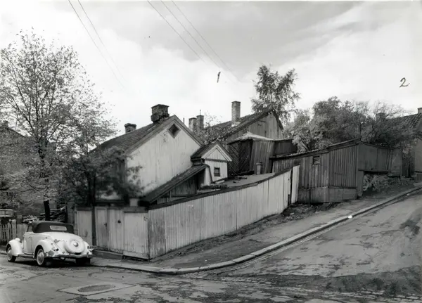 Enerhaugen, Oslo 1959. Johannesgata 4 og Stupinngata 10. Uthus og boliger. Bil parkert i gata.