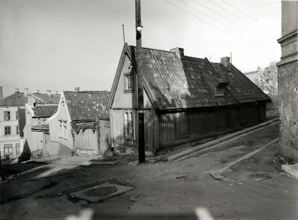 Enerhaugen, Oslo 1959. Johannesgata 4, bak lysmasta og Stupinngata 10 til høyre for dette. Gater og boliger.