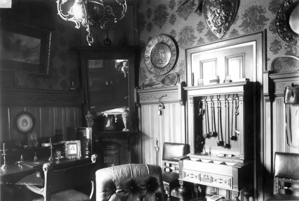 Drammensveien 53 II, Oslo, interiør, 1890-årene. Bolig for verkseier Kristofer Berg f. 1858 og hustru Sophie Dybwad f. 1861. Røykeværelset.