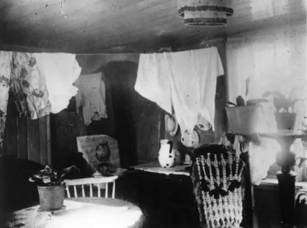 Interiør, stue, ant. Grønlandsstrøket, Oslo. Tett møblert rom med klestørk på snorer under taket. Fra Nanna Brochs boligundersøkelser i Oslo 1920-årene.