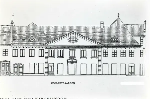 Collettgården, Kirkegata 15, Oslo. Nå på Norsk Folkemuseum. Tegning av fasade mot Tollbugata.